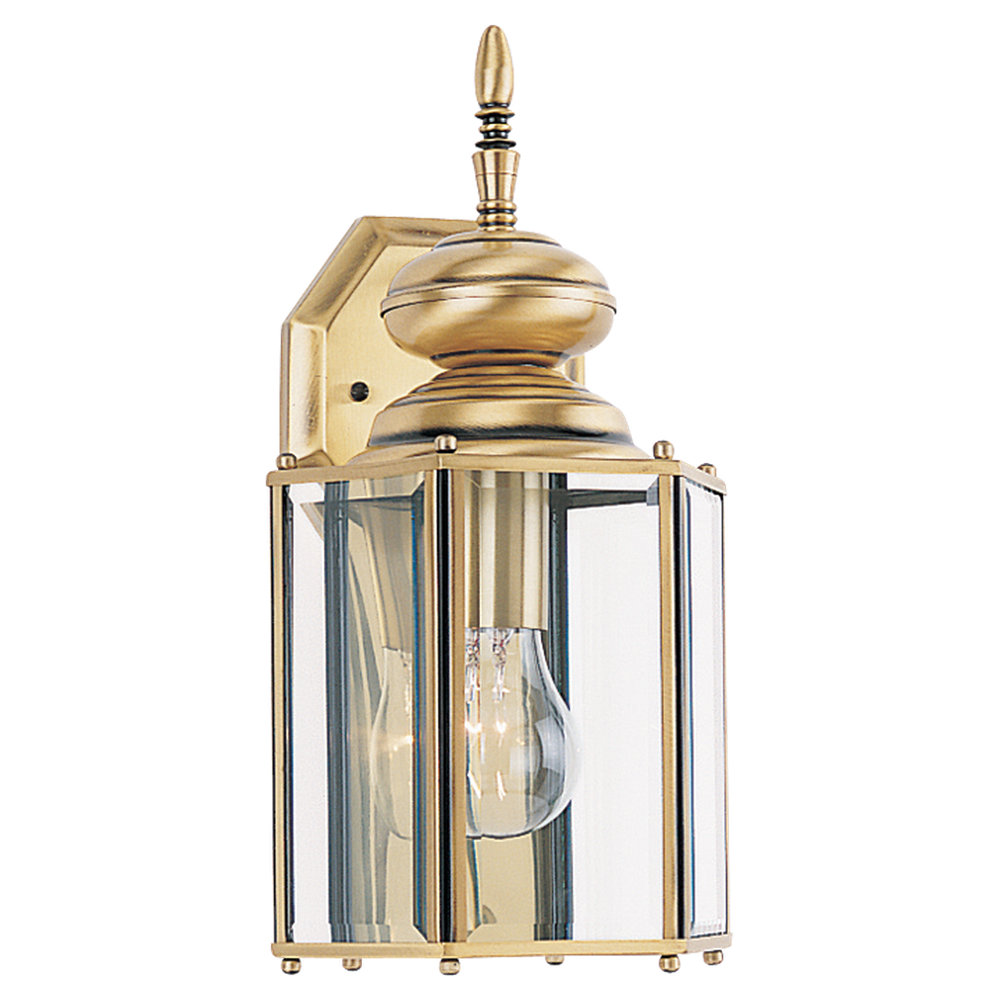 Outdoor wall lantern finished in antique brass over solid brass with clear beveled glass. |