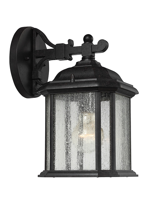 Outdoor wall lantern finished black over die-cast aluminum with clear seeded glass. |