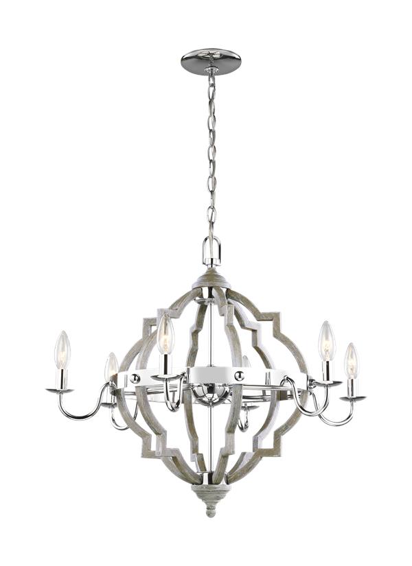 The Sea Gull Collection Socorro six-light chandelier in the washed pine finish supplies ample lighting to shine in an entryway or dangling over the kitchen island, adding an undeniable rustic charm. The bohemian decorative silhouette transcends off the barbed Quatrefoil profile combining a distressed oak finish with a rich washed pine finish on the chrome metal cup and decorative strapping. Use Clear incandescent bulbs to add to the aesthetic in the candelabra base lamping. The Sea Gull Collection by Generation Lighting has been an industry leader since 1919. Sea Gull's promise is simple - to create beautiful lighting at an affordable value. From space, to function, to style and energy efficiency, Sea Gull offers complete solutions. |
