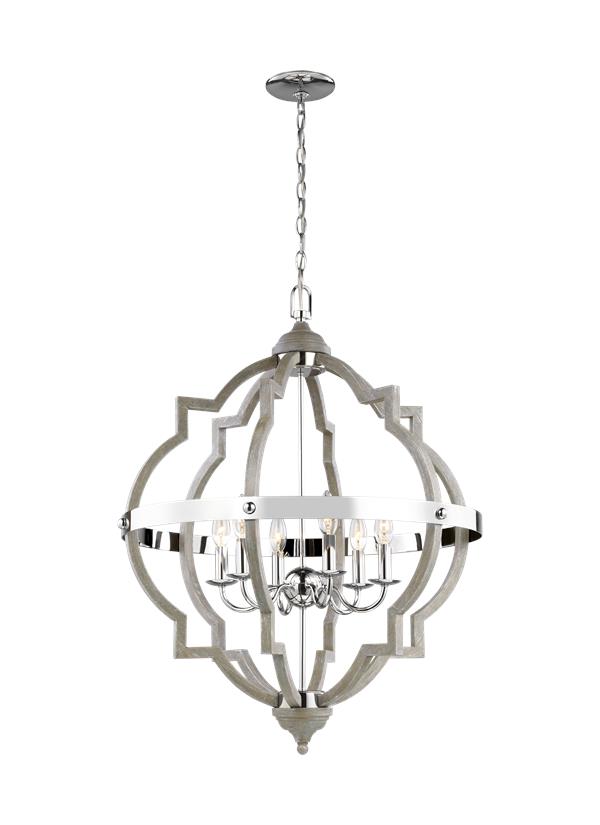 The Sea Gull Collection Socorro six-light indoor bohemian style pendant offered in a hand-painted dark weathered grey or washed pine and chrome finish features a modern take on this timeless industrial beauty. The decorative silhouette of barbed Quatrefoil profile combines a distressed oak finish with metal sockets and decorative strapping to create undeniable rustic charm. A candelabra-style bulb can add charm, and make an ambient light fixture statement in your kitchen or dining room. The Sea Gull Collection by Generation Lighting has been an industry leader since 1919. Sea Gull's promise is simple - to create beautiful lighting at an affordable value. From space, to function, to style and energy efficiency, Sea Gull offers complete solutions. |