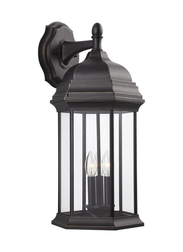 The Sea Gull Collection Sevier three light outdoor wall fixture in antique bronze brings timeless design to new heights with its traditional design details found in classic outdoor fixtures as well as an open bottom for easy maintenance. Made of durable cast aluminum, a multi-level crown, top finial and stepped-edge back plate complete the traditional look. Offered in Antique Bronze or Black finish, both with Clear glass, the collection includes a one-light outdoor pendant, one-light post lantern, a large one-light up light outdoor wall lantern, a small one-light up light outdoor wall lantern, a small one-light downlight outdoor wall lantern, and a large one-light downlight outdoor wall lantern. |