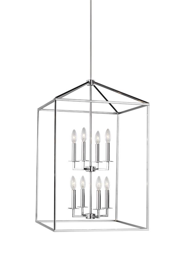 The Sea Gull Collection Perryton eight light indoor pendant in chrome is inspired by stately, carriage lanterns. The updated open frame is formed with sleek square steel tubing, and each pendant is a generously proportioned, minimalist silhouette completed in either textured Blacksmith or Heirloom Bronze finishes. Offered are small and large four-light hall/foyer pendants, an eight-light hall/foyer pendant and an eight-light island pendant. Candelabra base lamping. Damp rated, Perryton is also ideal as a focal point on a covered patio or porch. |