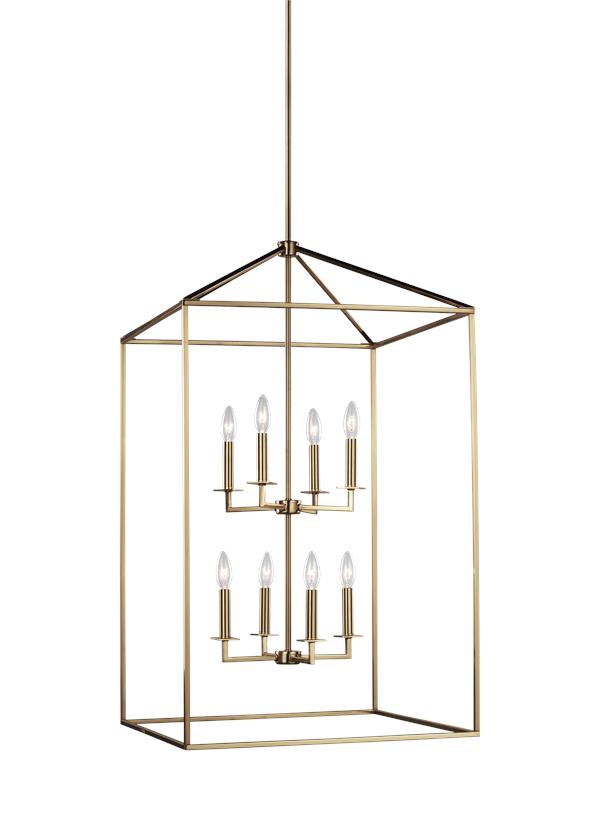 The Sea Gull Collection Perryton eight light indoor pendant in Satin Brass is inspired by stately, carriage lanterns. The updated open frame is formed with sleek square steel tubing, and each pendant is a generously proportioned, minimalist silhouette completed in either textured Blacksmith or Heirloom Bronze finishes. Offered are small and large four-light hall/foyer pendants, an eight-light hall/foyer pendant and an eight-light island pendant. Candelabra base lamping. Damp rated, Perryton is also ideal as a focal point on a covered patio or porch. |