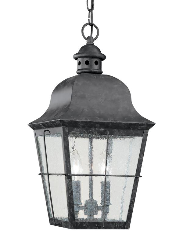 Colonial Styling in Two Light Outdoor Pendant with Oxidized Bronze Finish Solid Brass and Clear Seeded Glass for Texture. |