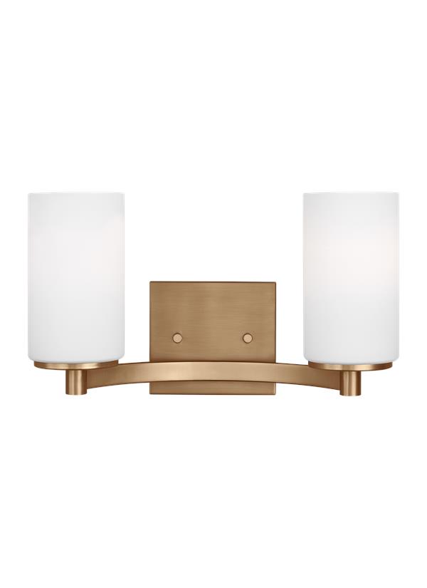 The Sea Gull Lighting Hettinger two light vanity fixture in Satin Brass provides abundant light for your bath vanity, while adding a layer of today's style to your interior design. The Hettinger lighting collection by Sea Gull Lighting combines a traditional look with chic, modern charm. The minimalism of the tubular glass shades balances with the unique, outward-curve of the semi-circular arm detail. Hettinger is available in three finishes - Bronze and Brushed Nickel for the whole collection, and Chrome, Midnight Black and Satin Brass for the bath vanities. The assortment includes six- and nine-light chandeliers; a one-light wall sconce; two-, three- and four-light bath vanity fixtures; a three-light pendant and two- light semi-flush convertible pendant. Incandescent and ENERGY STAR-qualified LED lamping are available; all fixtures are California Title 24 compliant. |