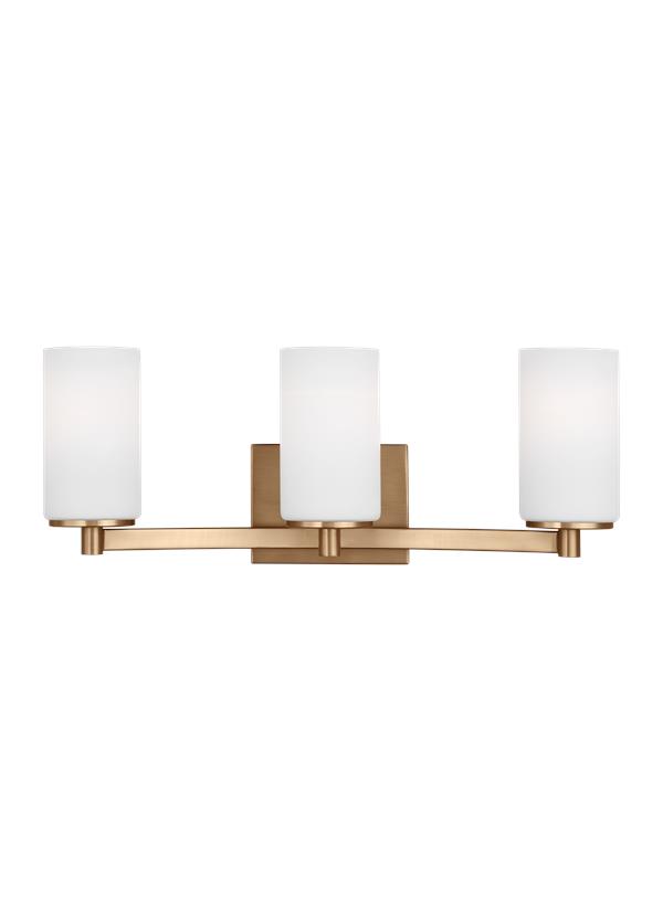 The Sea Gull Lighting Hettinger three light vanity fixture in Satin Brass provides abundant light for your bath vanity, while adding a layer of today's style to your interior design. The Hettinger lighting collection by Sea Gull Lighting combines a traditional look with chic, modern charm. The minimalism of the tubular glass shades balances with the unique, outward-curve of the semi-circular arm detail. Hettinger is available in three finishes - Bronze and Brushed Nickel for the whole collection, and Chrome, Midnight Black and Satin Brass for the bath vanities. The assortment includes six- and nine-light chandeliers; a one-light wall sconce; two-, three- and four-light bath vanity fixtures; a three-light pendant and two- light semi-flush convertible pendant. Incandescent and ENERGY STAR-qualified LED lamping are available; all fixtures are California Title 24 compliant. |
