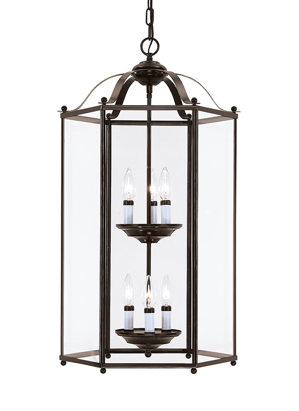 Heirloom Bronze Trimmed Foyer Pendant with Six Lights Displayed on Two Tiers. Long Clear Glass Panels All Around Reveal Radiance. |