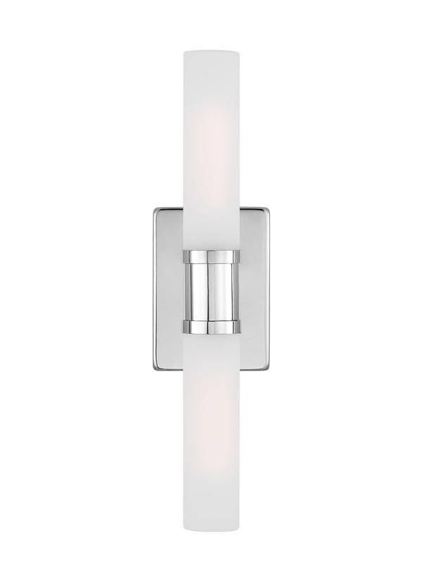 A contemporary addition to the bath, this damp-rated double sconce is crafted of metal, three finish options, and Satin Etched glass shade