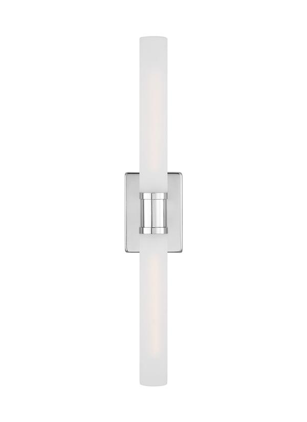 A contemporary addition to the bath, this damp-rated double sconce is crafted of metal, three finish options, and Satin Etched glass shade