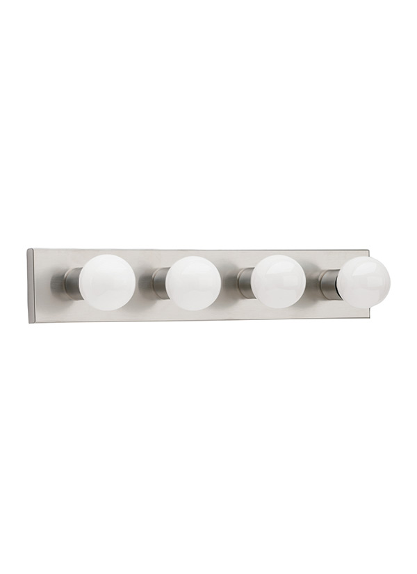 Four-bulb bar light fixture with stainless finish. Sockets spaced on 6" centers. |
